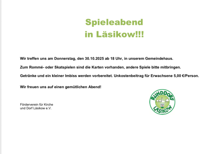 Wenn das Wetter nicht mehr mitspielt, findet der Spaß im Saal statt. Für den 30.September 2025 lädt der Förderverein für Kirche und Dorf Läsikow zu einem Spieleabend ein. Wir treffen uns gegen 18:00 Uhr in unserem Gemeindehaus. Für Speise und Trank wird gesorgt, ein Unkostenbeitrag von 5,00 Euro wäre zu entrichten. Jeder Interessierte kann seine eigenen Spiele mitbringen und vielleicht findet er ja Mitspieler. Wir wünschen allen einen schönen geselligen Abend.