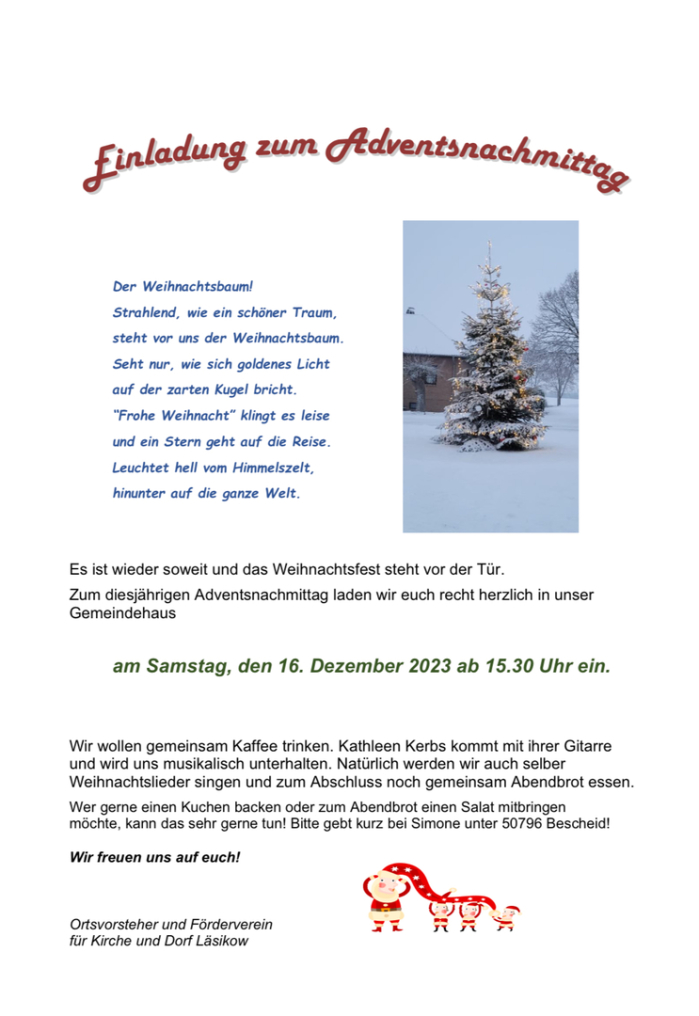 Der Förderverein Kirche und Dorf Läsikow lädt auch in diesem Jahr zu einem gemütlichen Adventsnachmittag ein. Kaffee trinken, Kuchen essen, gemeinsam singen und die Adventsstimmung genießen. Später zu Abend essen und den Tag gemeinsam ausklingen lassen.